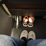 I got slippers! And socks! The socks have sticky bits on the bottom so the slippers stay on better. This is pretty much the most amazing thing that’s ever happened to me on a flight.